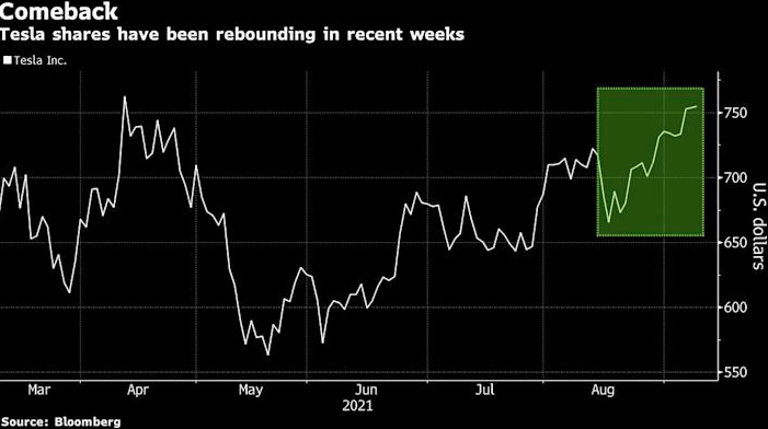 过去三周,特斯拉股价不断攀升,截至周四收盘,该公司市值增加了约750亿美元,主要得益于特斯拉上月在中国市场的汽车出货量出现反弹,以及8月份股市整体上涨。