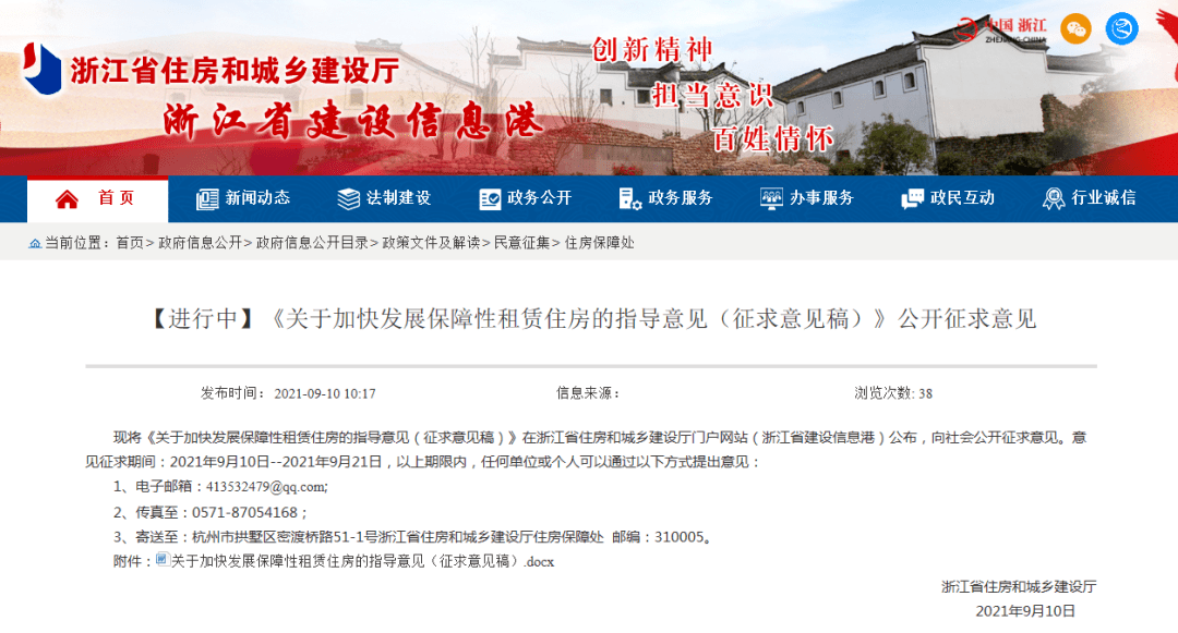 9月10日,浙江省住房和城乡建设厅网站公布《关于加快发展保障性租赁住房的指导意见(征求意见稿)》(下称“指导意见”),并向社会公开征求意见。此次意见征求期间为2021年9月10日--2021年9月21日。