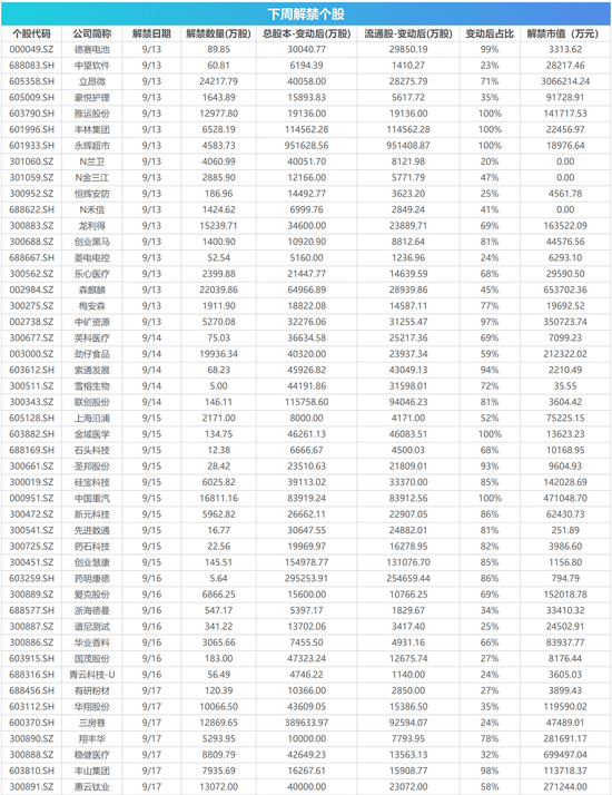 Wind数据统计显示,下周沪深两市限售股解禁数量共计22.98亿股,按9月10日收盘价计算,解禁市值为750.37亿元。从解禁市值来看,9月13日是解禁高峰期,15家公司解禁市值合计464.53亿元,占下周解禁规模61.91%。按9月10日收盘价计算,解禁市值居前三位的是:立昂微(306.62亿元)、稳健医疗(69.95亿元)、森麒麟(65.37亿元)。从个股的解禁量看,解禁股数居前三位的是:立昂微(2.42亿股)、森麒麟(2.2亿股)、劲仔食品(1.99亿股)。