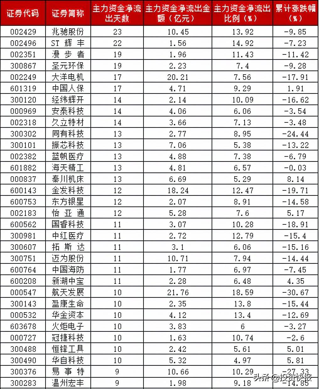 主力资金连续多日出逃,意味着短期内股价因资金的调仓换股而波动。根据同花顺iFinD数据统计,主力资金净流出天数超过10天共30股,具体有兆驰股份、ST辉丰、圣元环保、漫步者、大洋电机、中国人保、安泰科技、久立特材、经纬辉开、振芯科技、秦川机床、蓝帆医疗等。兆驰股份和ST辉丰净流出天数最多,均超过20天,是主力资金疯狂出逃的重点对象。