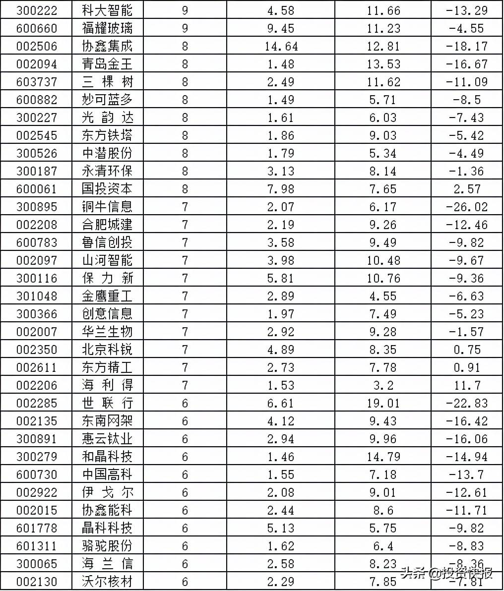 最后一看,根据市场表现来看,区间累计跌幅超10%的共36股,其中航天发展、易事特、铜牛信息、同有科技、世联行的跌幅均超过20%。航天发展因半年报业绩不及预期,近期股价连续下跌创出年内新低,公司上半年实现营收22.22亿元,同比增长15.02%,归母净利润为3.14亿元,同比增长0.69%,显而易见的低于行业整体增速。