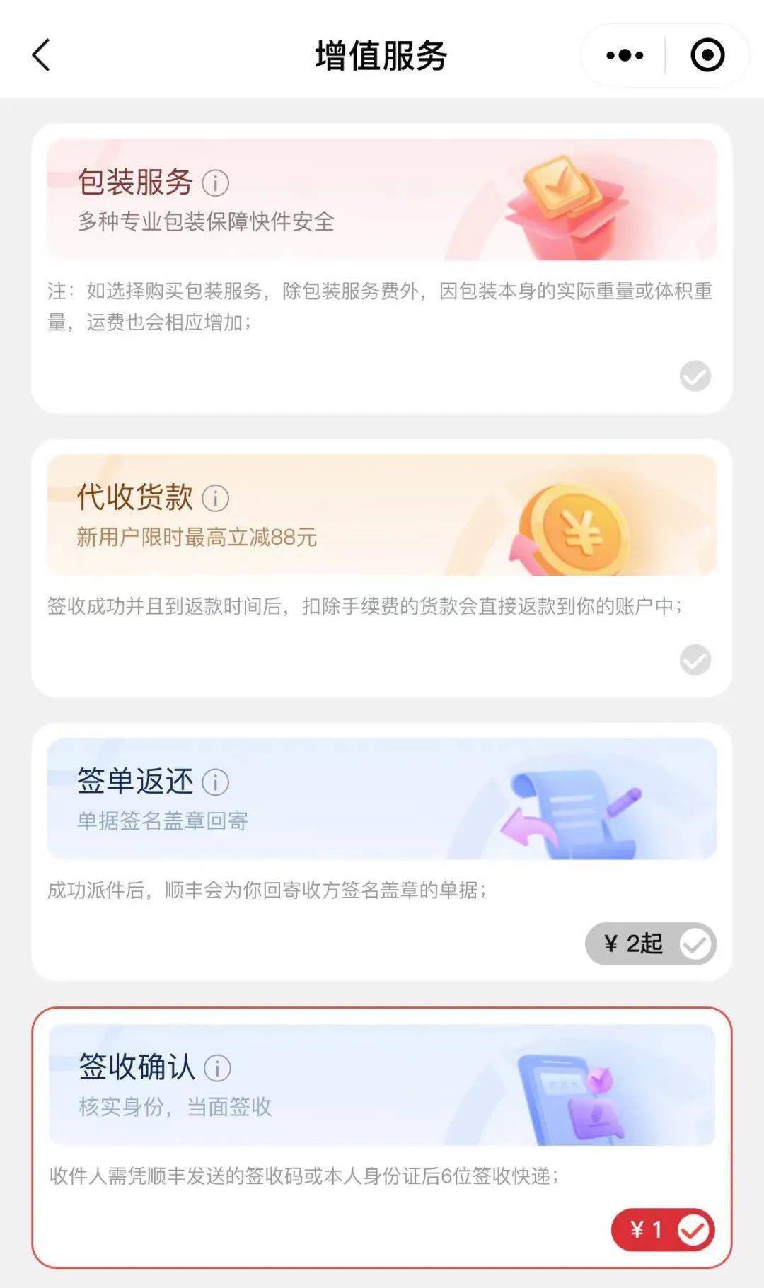 记者登陆顺丰速运小程序,在寄件下单页面下增值服务中,看到“签收确认”这一服务。