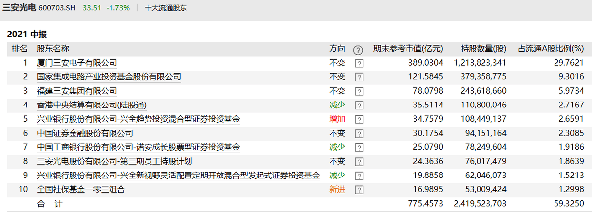国家基金由财政部发起并投资,主要投向芯片制造领域。截至公告披露日,其持有三安光电股票3.79亿股,约占公司总股本的8.5%。2020年下半年,国家大基金曾通过集中竞价的方式减持公司股份约0.82亿股,减持总金额达21.29亿元。