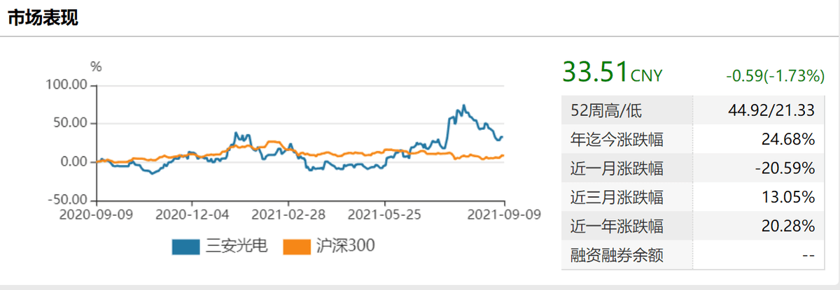 随着行业复苏与业绩大涨,三安光电今年成为资本热捧的个股。尤其是今年6月至7月,公司股价在二级市场上高歌猛进,两个月累计上涨55%。9月9日,三安光电报收33.5元/股,市值1501亿元,动态市盈率达到70倍。