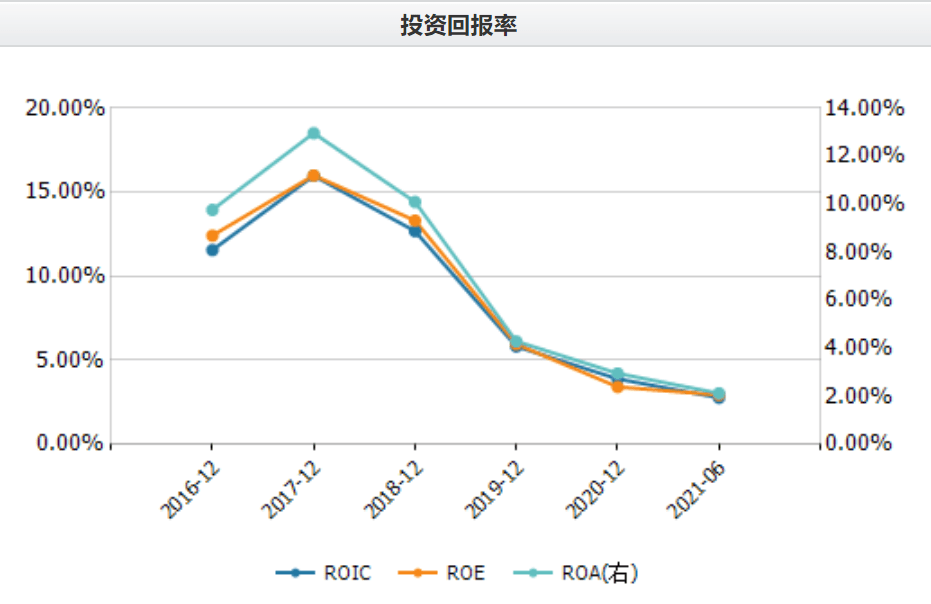 投资回报率也有待恢复。最近三年半,公司每股收益为0.69元/股、0.32元/股、0.24元/股,0.2元/股,净资产收益率(加权)为13.43%、6%、4%、3.9%。同样在行业内排名中等偏下。