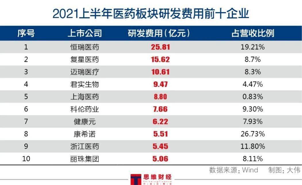 根据《投资者网》统计,从半年报披露的数据来看,2021上半年390家医药企业研发总额为334.1亿元,同比增长超30%。其中恒瑞医药研发费用为25.8亿元,同比增长超38%,是上半年医药企业中研发费用支出最高的一家,复星医药和迈瑞医疗紧随其后。
