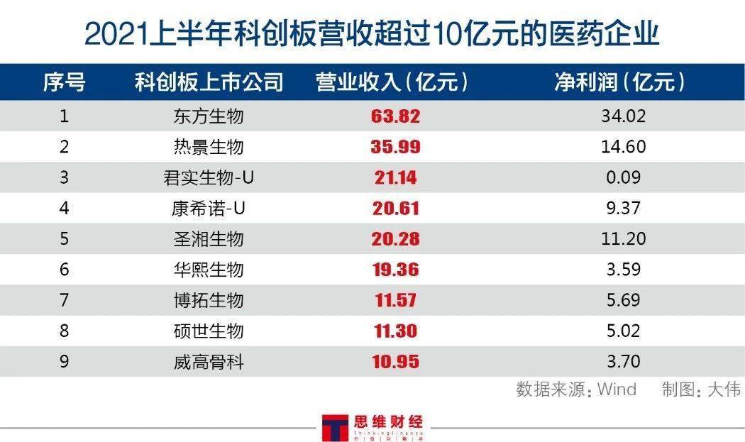 在整个A股医药板块中,科创板可以说是较为特殊的一部分,根据Wind数据,科创板72家公司2021年上半年实现营收395.3亿元,同比增长幅度超95%,其中9家企业实现营收超10亿元;上半年实现净利润总额120.2亿元,同比增长接近200%,其中15家医药企业同比增长超过100%,医疗器械、医疗服务、生物制药企业营收和净利润排名都比较靠前。