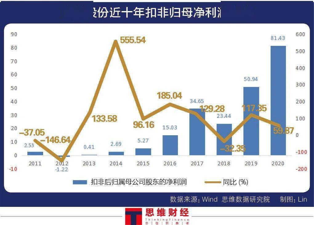 扣非后归母净利润方面,2020年隆基股份这项数据已达81.43亿元,相比2011年的2.53亿元,翻了31倍。
