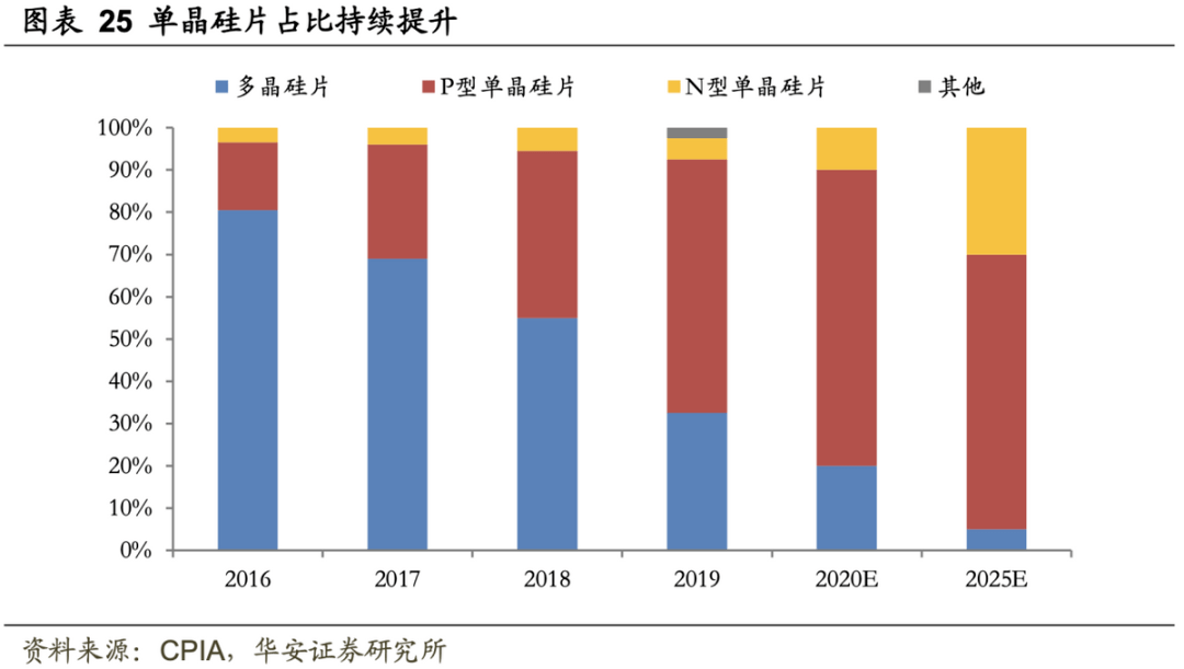 据中国光伏协会数据显示,2016年多晶硅片是市场主流,占比高达80.5%。2019年多晶硅片占比下降至33%左右,预计今年进一步下降至20%。