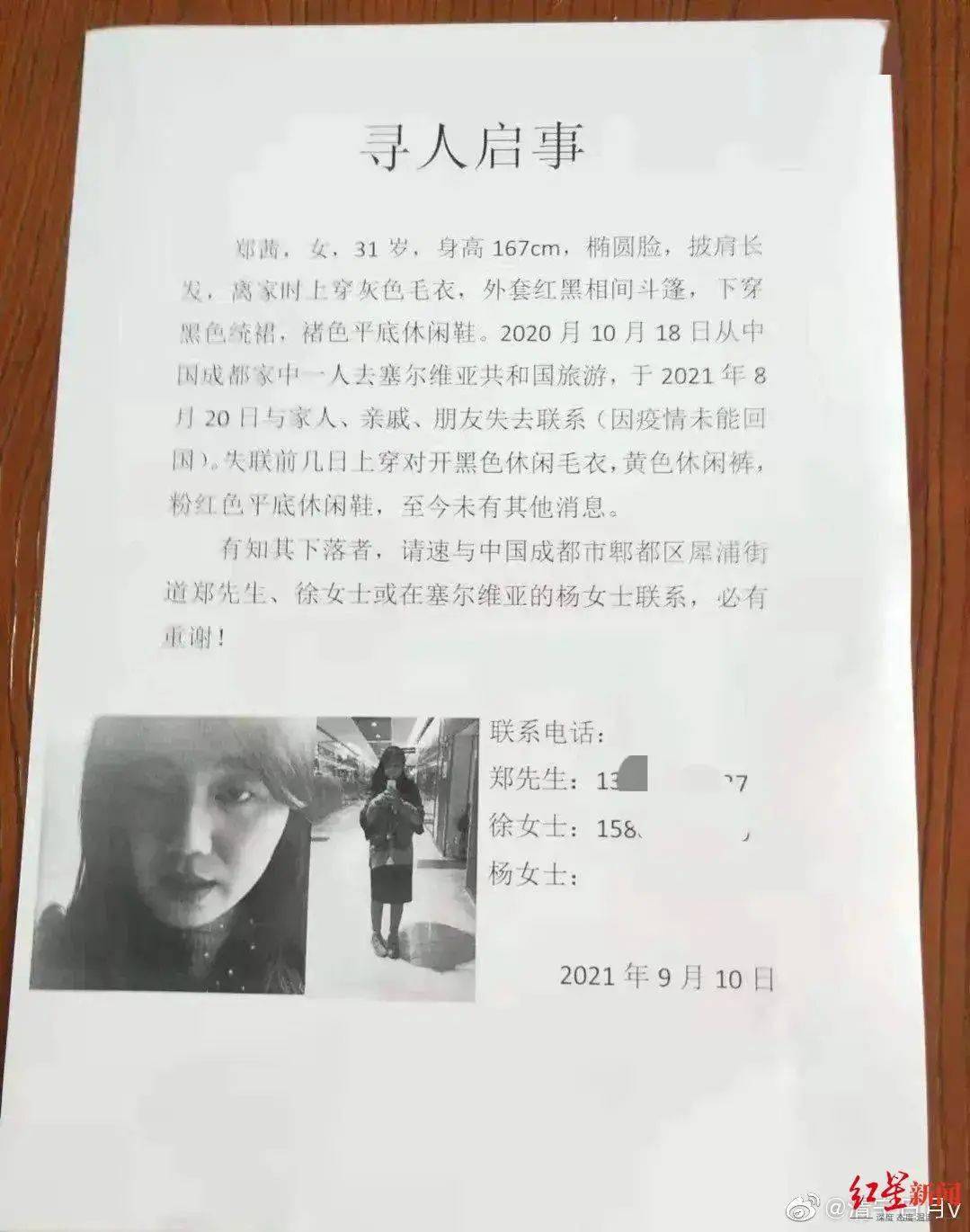据家住成都郫都区的郑先生发布寻人启事称,其女儿小郑于2020年10月18日从家中出发独自一人去塞尔维亚旅游,期间因疫情滞留在塞尔维亚未能回国。