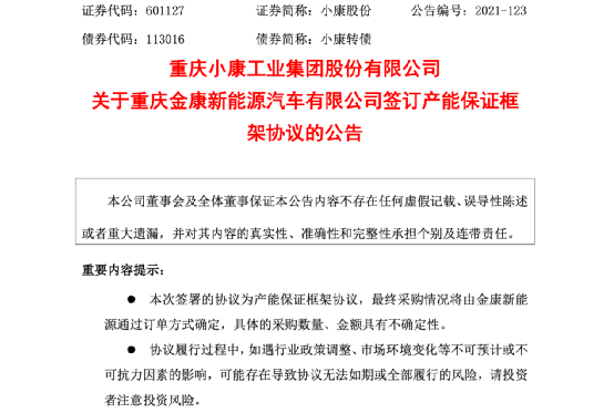 小康股份表示,本协议的签订符合公司经营需要,有利于双方建立长期战略合作关系,保障公司动力电池的长期稳定供应,实现产业互动和互利共赢,对公司实施精品战略打造高端智能电动汽车具有积极意义,符合公司发展战略规划。本协议对公司2021年度经营业绩不构成重大影响。