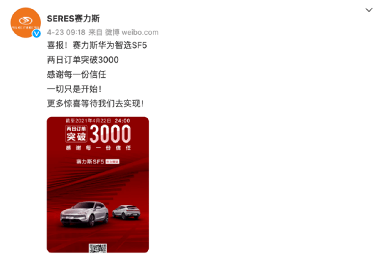 不过,SF5上市的热潮退去后,其销量似乎有点扑朔迷离。刚上市不久后,赛力斯官方宣布,SF5两日订单突破3000辆。但根据乘联会公布的数据显示,2021年4月至7月,赛力斯华为智选SF5累计销量为2087辆。也就是说,相当于每月只销售出约500辆,这与双方的投入相差甚远。