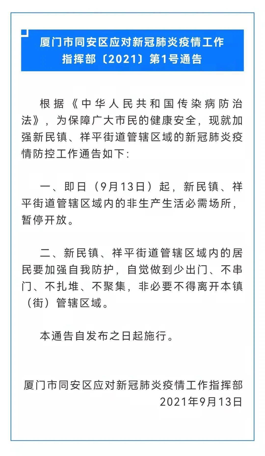 据“同安发布”微信号消息,厦门市同安区应对新冠肺炎疫情工作指挥部13日凌晨发布的2021年第1号通告称,加强新民镇、祥平街道管辖区域的新冠肺炎疫情防控工作。