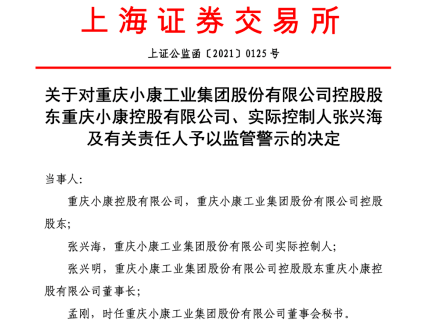 相关责任人对上述违规事项负有相应责任。鉴于违规事实和情节,根据有关规定,决定对小康股份控股股东小康控股及其董事长张兴明、实际控制人张兴海、重庆小康工业集团股份有限公司时任董事会秘书孟刚予以监管警示。