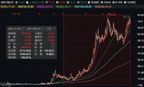 同时,小康股份的股价连续飙涨,截至目前,该股年内已经累计涨超338%,期间最高涨幅近5倍。截至发稿,该股报74.97元,总市值1018.12亿元。