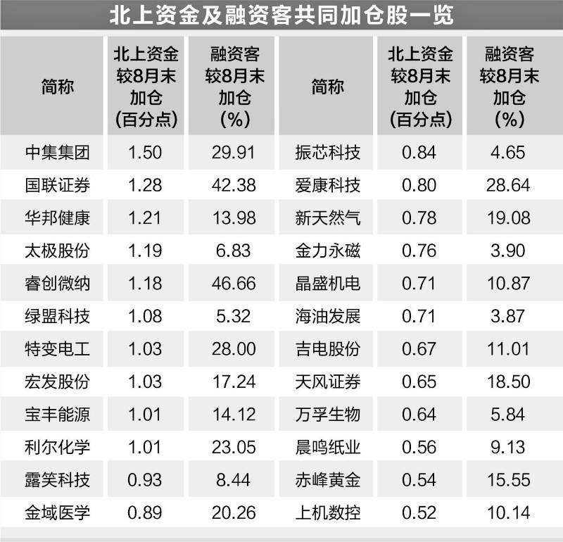 数据宝统计,9月份以来北上资金持股比例较8月份加仓0.5个百分点以上、融资客同期加仓幅度超3%以上的个股有24只,主要分布在电气设备、公用事业、化工等行业。工业母机龙头上机数控、氢能源龙头宝丰能源均在列。上述个股中,北上资金加仓比例居前的有中集集团、国联证券、华邦健康、太极股份等,均超过1个百分点融资客加仓幅度超过20%的有睿创微纳、国联证券、中集集团等7股。