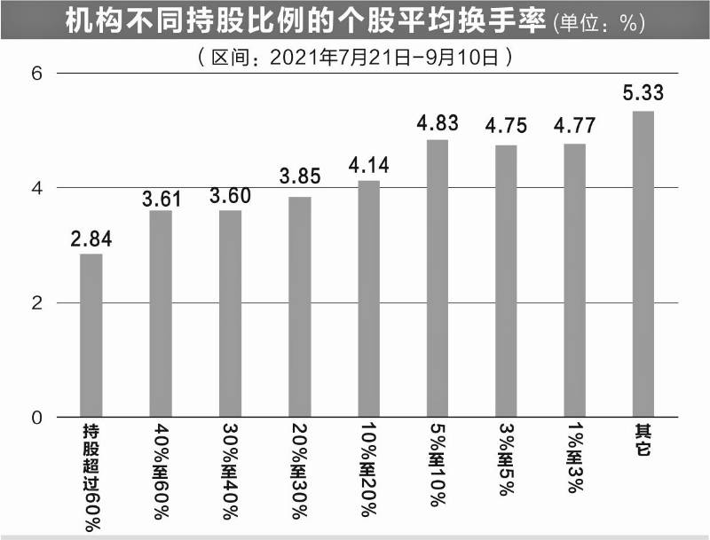 数据显示,个人投资者交易也更加频繁。对2021年半年报数据分析发现,自7月21日以来筹码越分散的股票,换手率越高,这种规律在以往并不明显。具体来看,机构持股比例超过60%的股票,区间内日均换手率不到3%机构持股低于1%的股票,日均换手率超过5%。