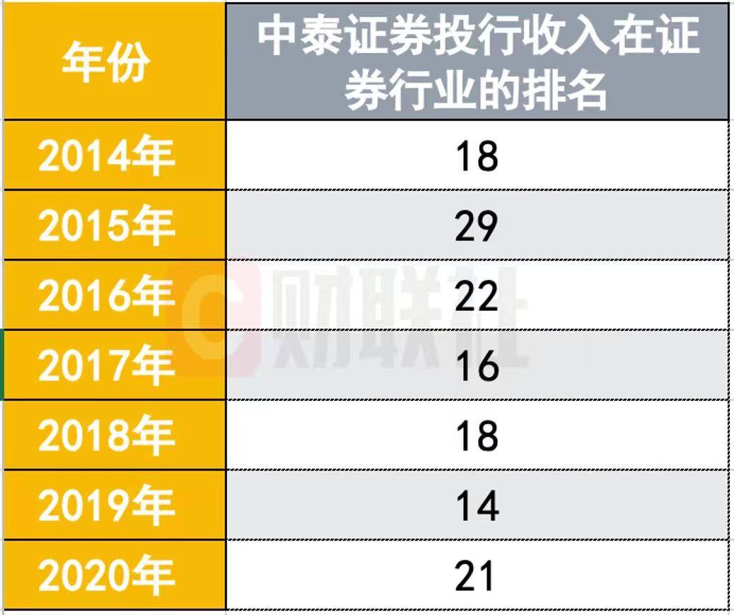上述知情人士向记者透露称,近几年来看,投行业务增量并不显著。不过,从中泰证券投行表现来看,投行收入占比保持相对稳定状态,从2013年的5.36%提升至2020年的7.1%。而从中证协的经营业绩排名看,中泰证券的投行收入排名几乎在第20位上下,其中2019年实现了近来最高的排名,为第14位。