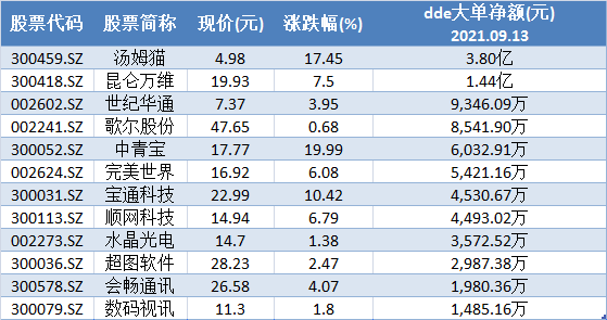 9月13日大单资金净额超1000万元的元宇宙概念股: