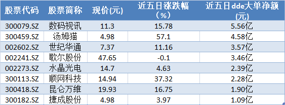 从近5日主力资金流向方面来看,共有8只元宇宙概念股期间大单资金净流入额超亿元,合计吸金达近25亿元。其中最受主力资金追捧的是数码视讯,以5.56亿元的期间累计大单净流入高居榜首。另外,汤姆猫、歌尔股份、世纪华通、顺网科技、水晶光电、昆仑万维、捷成股份等7只个股均获得超亿元资金抢筹。