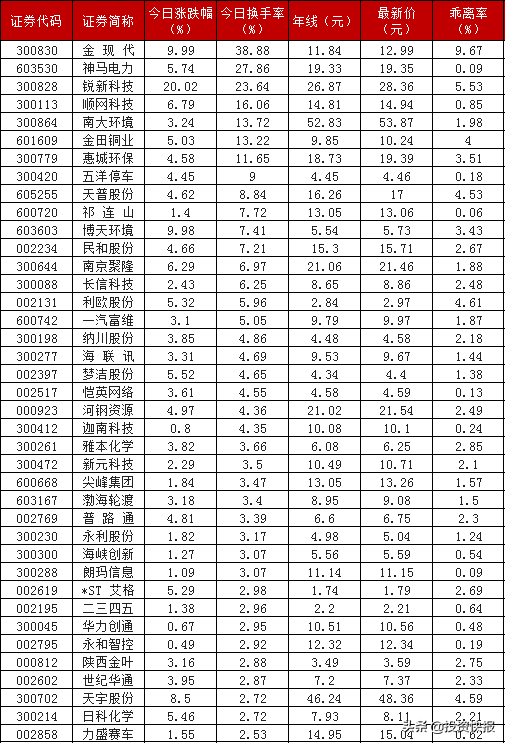 相反,乖离率越低,代表股价刚刚站上年线,累计涨幅较少,具体有浦东金桥、特一药业、神州高铁、祁连山、朗玛信息、神马电力、恺英网络、红豆股份、五洋停车、永和智控、迦南科技、民丰特纸、东软集团、秦安股份、长虹美菱、国新文化、大晟文化,它们的乖离率均处于0.5%以下,股价近期一直围绕均线呈盘整运作。