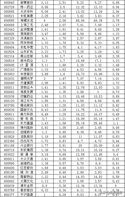 乖离率是测量股价偏离均线大小程度的指标,如果一只股票保持高乖离率且突破回踩年线位置,那么年线将会成为支撑线,未来趋势将会向好,在现今震荡走势中可作为持股或买入的重要信号。根据iFinD数据统计,从个股乖离率来看共有45股大于1%,其中金现代、锐新科技、利欧股份、天宇股份、天普股份、金田铜业、洪涛股份、惠城环保、博天环境的换手率分别是9.67%、5.53%、4.61%、4.59%、4.53%、4.08%、3.97%、3.51%、3.43%。