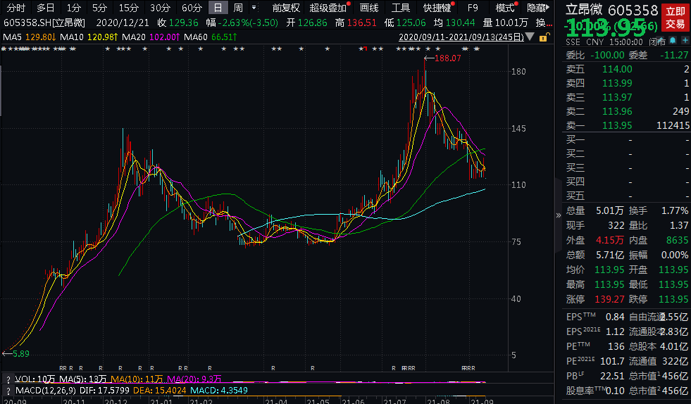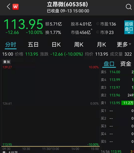 受此重大利空刺激,今日(9月13日) 立昂微 开盘后直接一字跌停,最终报113.95元/股,封单数量最高超过11万手, 市值蒸发超50亿元,相当于解禁前的全部流通市值。