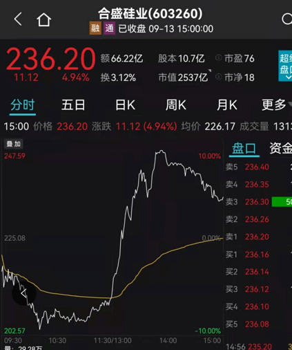 盘中一度地天板的合盛硅业,最终收涨4.94%,最新市值2537亿元。