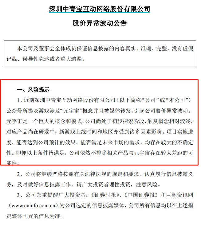 随后,公司发布股价异常波动公告。提示相关风险:元宇宙是一个巨大的概念和模式,公司尚处于初步探索阶段,触及概念相对较浅,对应产品尚在研发中,新游戏上线时间和地区亦受到诸多因素影响。项目实施进度、能否达到公司预计的效果、能否满足未来市场的需求,均存在较大的不确定性。即便以上条件皆满足,公司依然不排除相关产品与元宇宙存在较大差距的可能性。