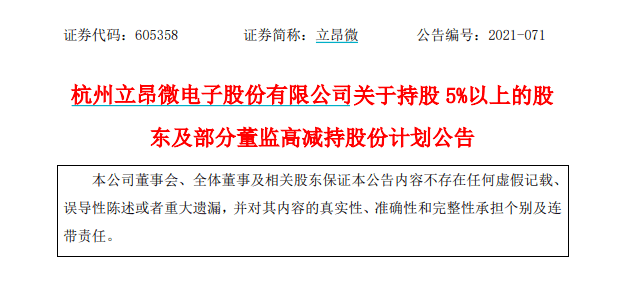 而盘后,立昂微发布关于持股5%以上的股东及部分董监高减持股份计划公告。
