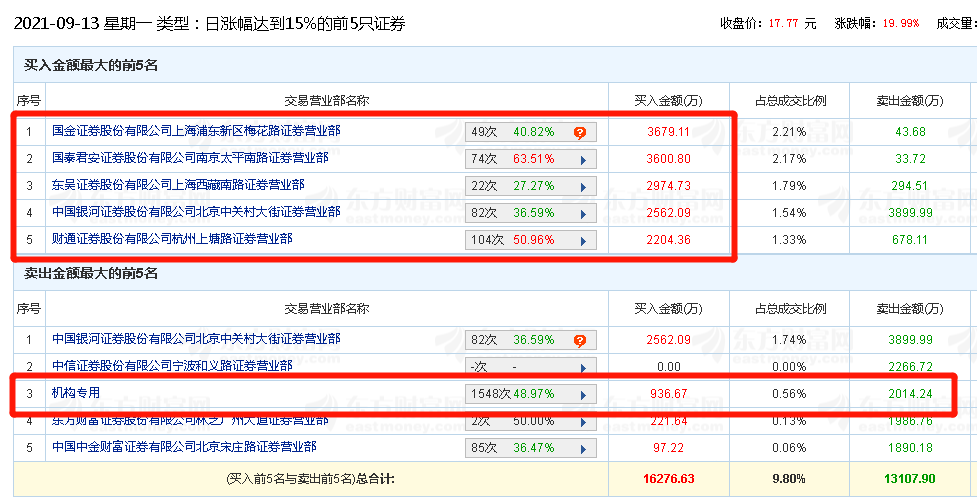 而今天盘后数据显示,今日 国金证券 上海梅花路买入3679万元, 国泰君安 南京太平南路买入3600万元,一机构卖出2014万元。