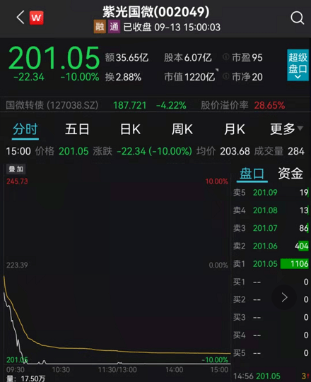 今天,另外一家千亿半导体巨头紫光国微也放量跌停。最新股价201元每股,市值1220亿元。