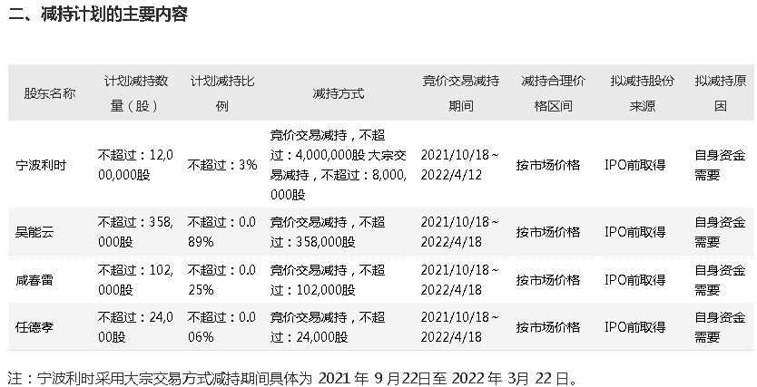 减持计划的主要内容:自本减持计划公告之日起 15 个交易日后的6个月内, 宁波利时计划通过集中竞价交易方式减持公司股份数量不超过400万股,占公司总股本的1%,且在任意连续 90 日内,减持公司股份数量不超过公司总股本的1%;自本减持计划公告之日起3个交易日后的6个月内, 通过大宗交易方式减持公司股份数量不超过800万股,占公司总股本的2%,且在任意连续 90 日内,减持公司股份数量不超过公司总股本的2%。
