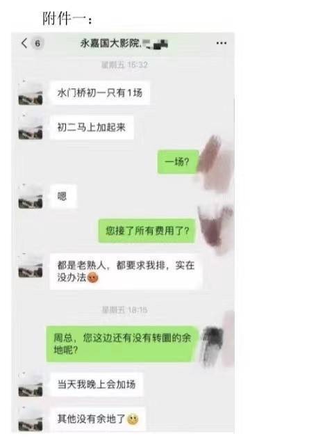 此前,浙江博纳影视制作有限公司发布的《关于暂停与永嘉国大影院合作通知》中,一张双方沟通排片的微信聊天截图显示,永嘉国大影院大年初一(首映日)给《水门桥》的排片为一场,初二排片会跟上。而在博纳方发布暂停合作通知的第二天,该影院发布了《致歉信》。