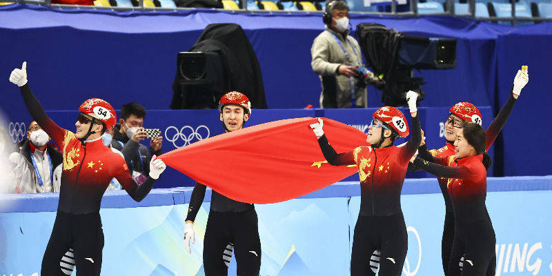中国体育代表团在短道速滑混合团体接力中收获了本届冬奥会的首枚金牌!