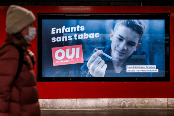 当地时间2022年2月8日,瑞士洛桑,街头的烟草广告。据瑞士资讯网1月11日报道,瑞士联邦将于2月13日公投“是否部分禁止烟草广告”,目前正反双方正进行最后角力。最新民调显示,支持禁止向青少年和儿童投放烟草广告的受调查者比例占73%,明显高于反对者(25%)。