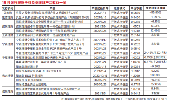 19只产品均是净值型产品,起始产品净值为1元,截至2月10日,有9只产品的净值超过1,另外10只产品均跌破净值。