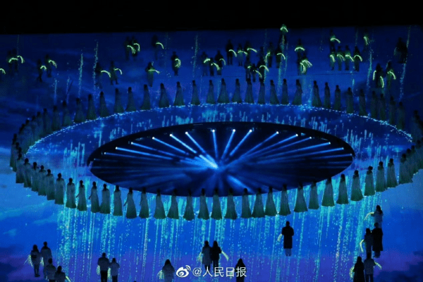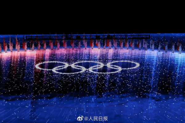 2008北京冬奥会主题曲我和你再次响彻鸟巢,鸟巢重现2008奥运五环。图片来源:人民日报微博