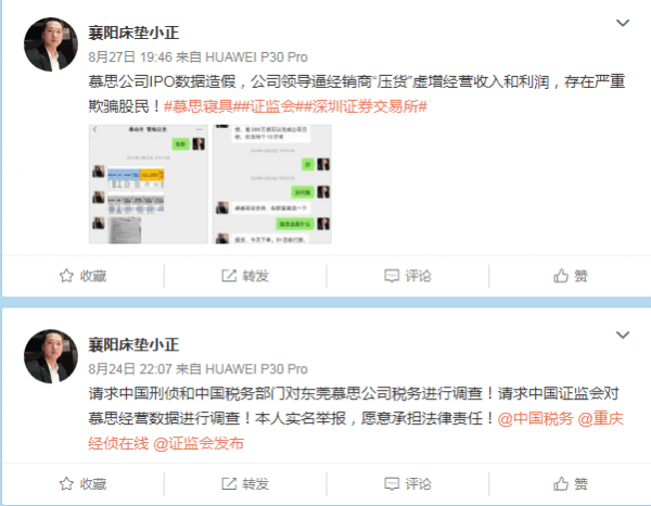微博用户“襄阳床垫小正”自称是慕思股份的前经销商郑刚,自8月17日起,郑刚在微博发布多条关于慕思股份的内容。除了27日提及的IPO数据造假外,他还提及慕思股份存在偷税漏税的行为。经济观察网联系到郑刚,他表示微博上的内容都是真实情况,他也已经向税务机关及证监会实名举报。