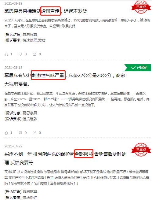 除此之外,有不少消费者投诉慕思股份疑存在虚假宣传与产品质量问题。在黑猫投诉网上,有关慕思股份旗下的床垫、床架等寝具存在刺激性气味、甲醛超标、塌陷、以及店铺虚假宣传却不发货等问题的投诉均不止一条。