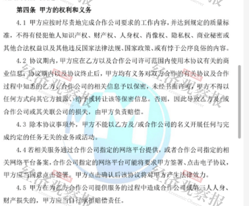 这是协议中第四条“甲方的权利和义务”中的第5点。本来这是关于外卖骑手权利和义务的部分,不过范围表示,没有一条内容是关于骑手权利的,全部都是义务内容。