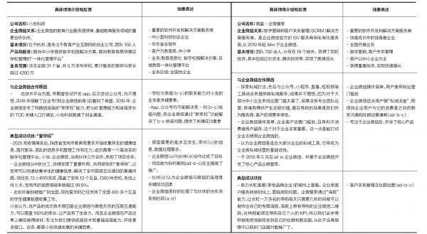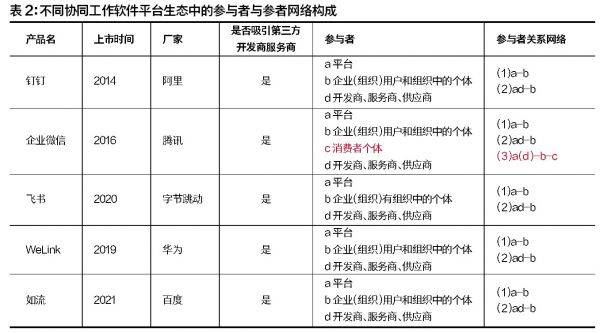 可以发现,他们在参与者和参与者关系网络两个维度上存在共同点,均包括了a平台、b企业用户和d开发商、服务商、供应商,三者之间形成了里两种关系结构:(1)a-b,即平台以产品形态(如即时通信、基本OA等)服务企业用户;(2)ad-b结构,企业用户采购平台提供的第三方软件和服务,即a平台与d伙伴共同服务b企业用户。