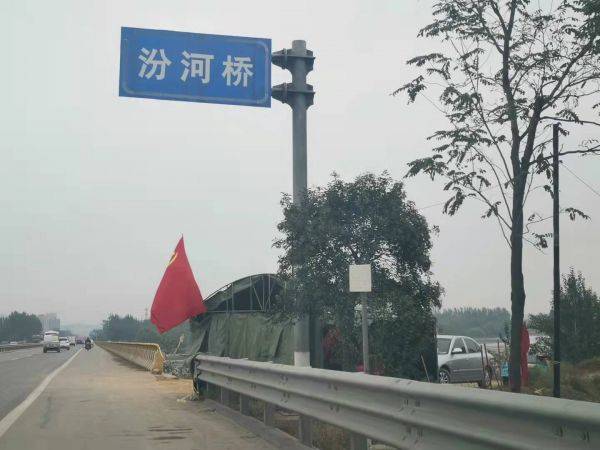 10月10日下午5时左右,记者从209国道汾河大桥周围的堤坝上看到,坝上每隔数百米就有一个巡逻值守岗位,均是临时搭建的简易帐篷,一个岗位有五六个人值守。