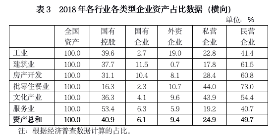 1、国有企业与民营企业在各行业中的资产占比。(见表3)