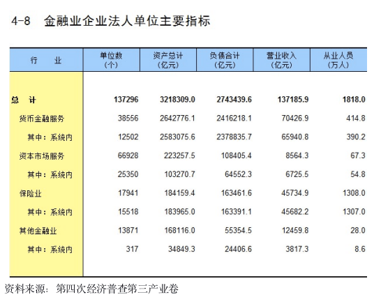 根据经济普查数据,2018年全国金融业企业法人单位资产总额为321.8万亿元,其中系统内企业资产总额为290.5万亿元(见下图表)。根据2019年国务院向全国人大提供的国有资产管理情况报告,2018年,全国金融类国有控股企业资产总额为264.3万亿元,占全国金融业企业法人单位资产总额321.8万亿元的82%。