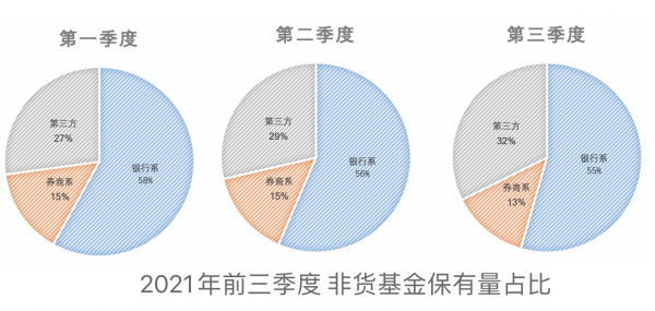 其中,非货币保有规模排名前五的三方机构是蚂蚁基金、天天基金、腾安基金、基煜基金、盈米基金,占同类机构比例约为86.9%。