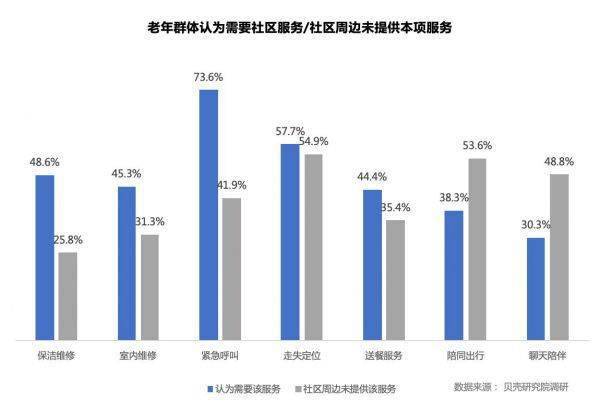 在对社区服务的要求上,老人同样看重人身安全,73.6%的老人认为需要紧急呼叫服务,57.7%需要走失定位服务,其次是居家类社区服务,如保洁维修(48.6%)。不过,社区内服务项目已经大多覆盖保洁和维修,相对来说,人身安全类覆盖率较低。