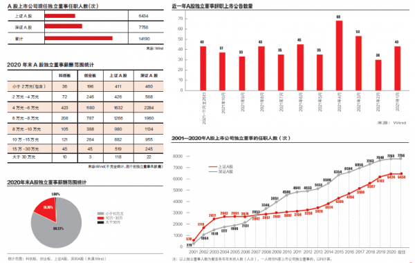 Wind数据显示,自2001年中国证监会发布《关于在上市公司建立独立董事制度的指导意见》以来,近20年内独立董事队伍日益壮大,A股上市公司聘任的独立董事人数从当初的不到900人(次)上升到目前近14000人(次),增长了约22倍。