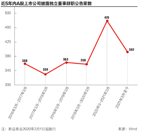 以新《证券法》实施后为时间截点,记者统计发现,2020年3月份之后,上市公司披露独立董事辞职公告家数明显上升,2020年3月至2021年3月数量为479家,而2019年3月至2020年3月数量为358家,同比上升了近34%。
