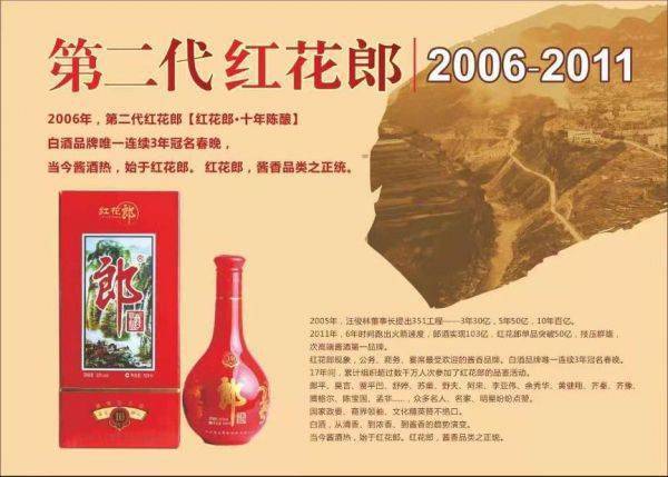 第二代红花郎依然保持了第一代高品质酒体水准,并在包装上做了适当精修,优化了印刷工艺,调整山水画色彩,采用宋明时期的青绿山水画风,颜色更加明艳夺目。这期间,红花郎连续3年冠名春晚。